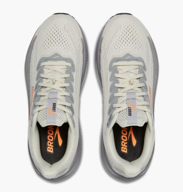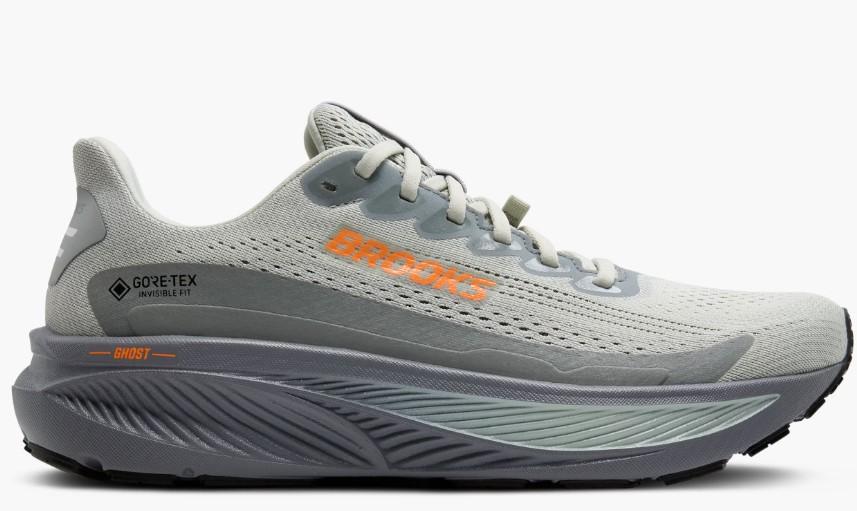 - El empeine de las deportivas para hombre de Brooks Ghost 17 grises lleva la membrana impermeable GORE TEX Invisible Fit.