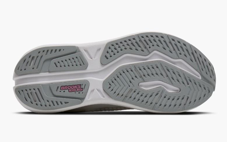 - El piso de los zapatos para mujer de Brooks Revel MAX grises lleva zonas de caucho que aseguran tracción y durabilidad.