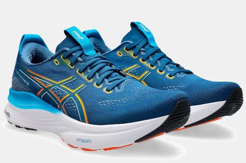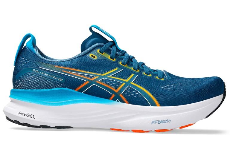 - La media suela de las deportivas para hombre de Asics Gel-Kayano 32 azules lleva la tecnología PureGEL combinada con la espuma reactiva FF BLAST PLUS, que ofrece una alta capacidad de amortiguación y absorción del impacto.