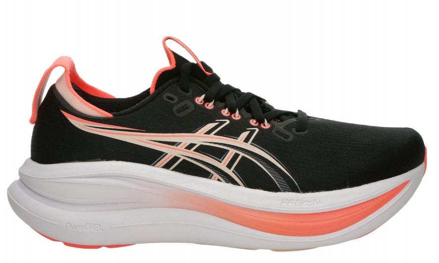 - La base de las zapatillas de running de Asics para mujer Gel-Nimbus 28 lleva la tecnología PureGEL combinada con la espuma reactiva FF BLAST PLUS, consiguiendo una mayor amortiguación y propulsión en la carrera.