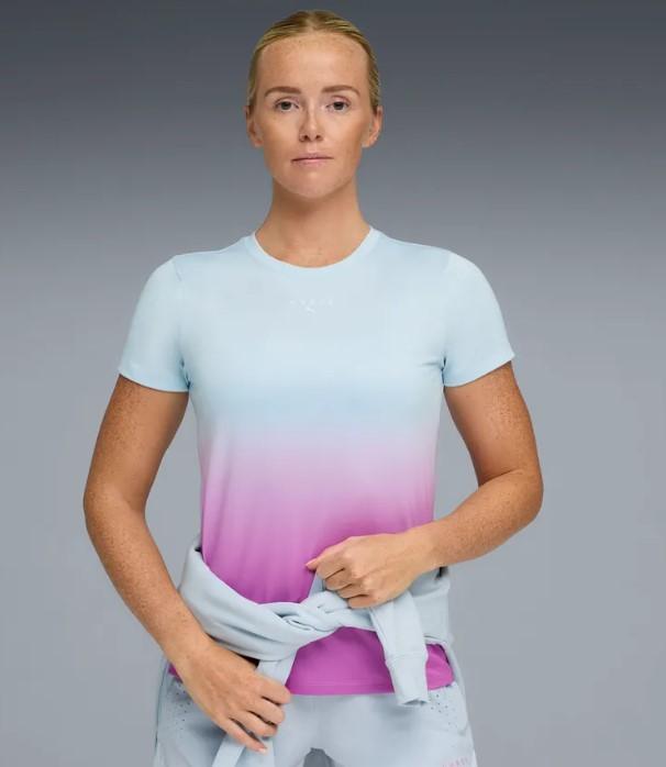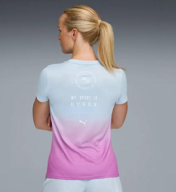 Camiseta para mujer de Puma de Hyrox en color azul y rosa.