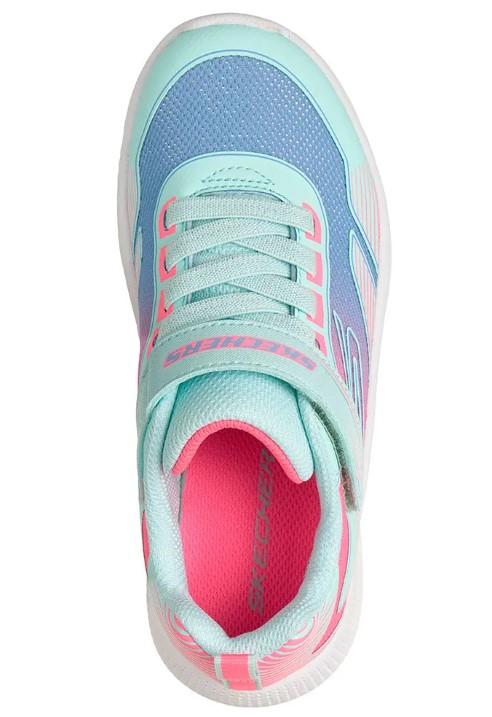 Calzado deportivo de Skechers para niña Microspec Advance Oasis Point en color azul turquesa y rosa.