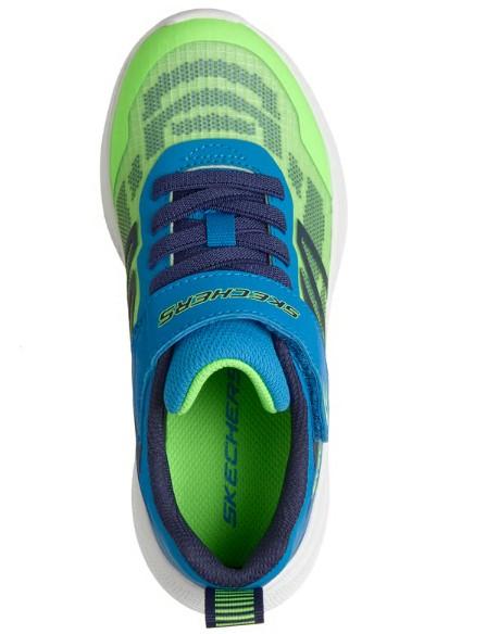 Calzado deportivo de Skechers con velcro para niños Microspec Velocity en color lima y azul.
