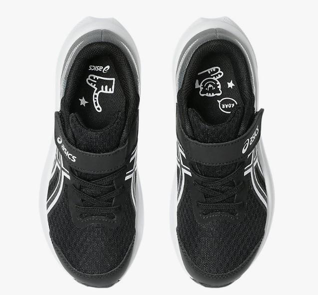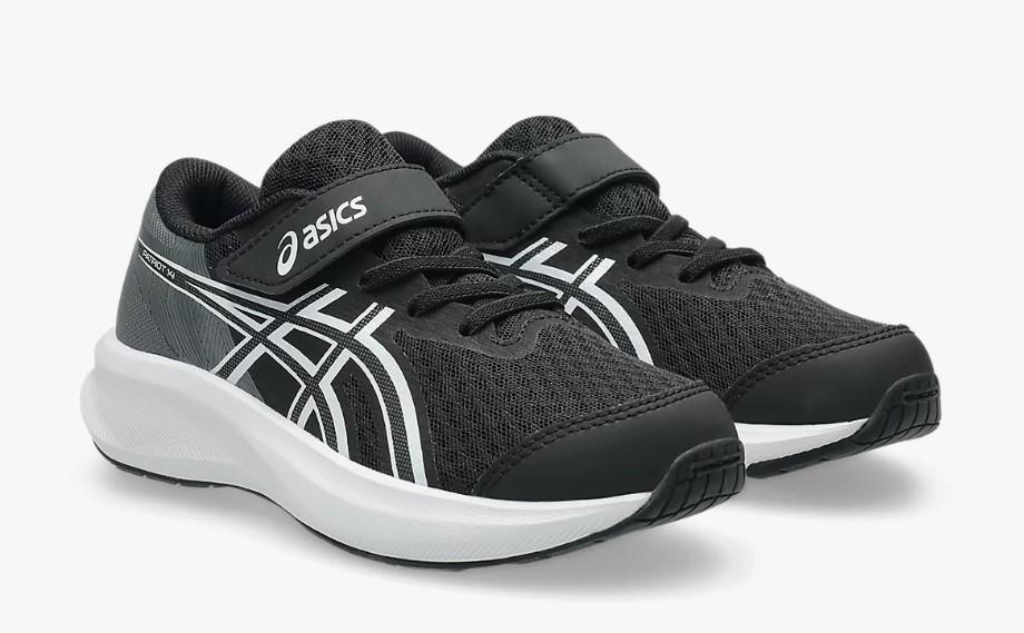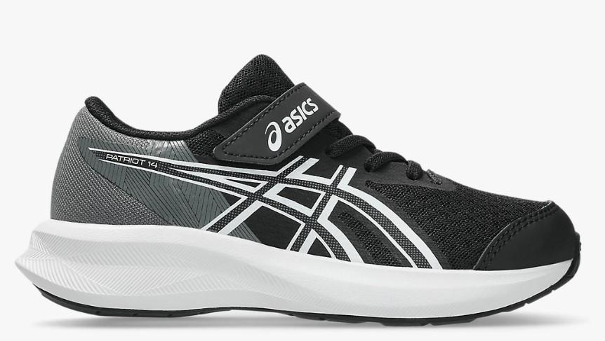 Calzado de running de Asics con velcro para niños Patriot 14 en color negro y blanco.