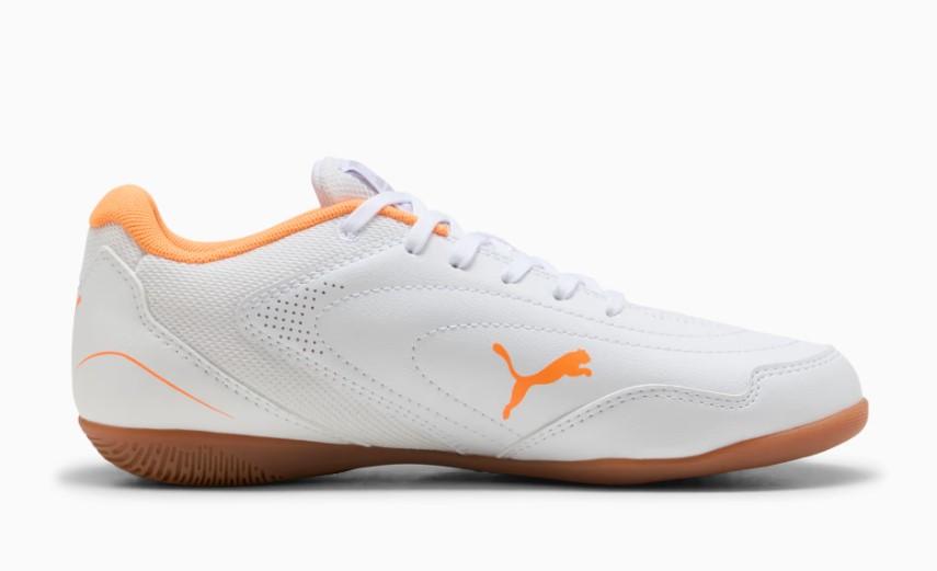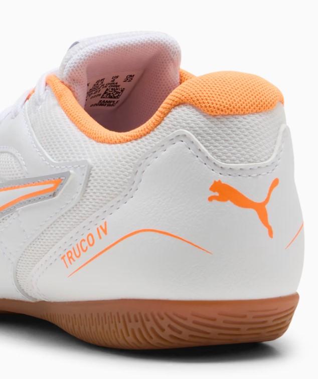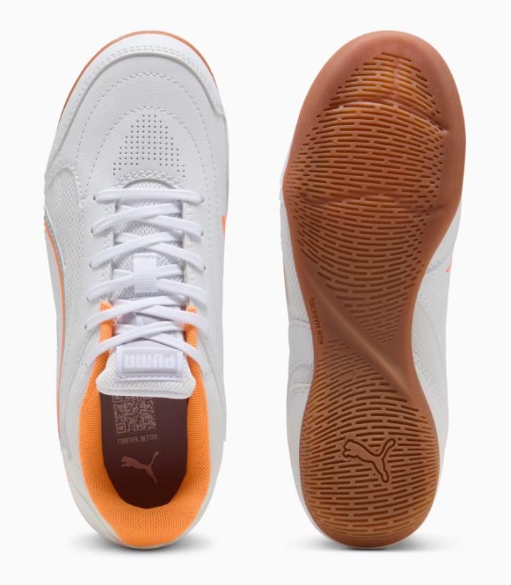Botas de fútbol sala de Puma para niños Truco IV en color blanco y naranja.