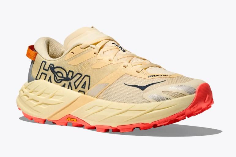 Calzado de trail running de Hoka One One para mujer Speedgoat 7 en color amarillo.