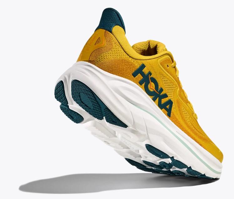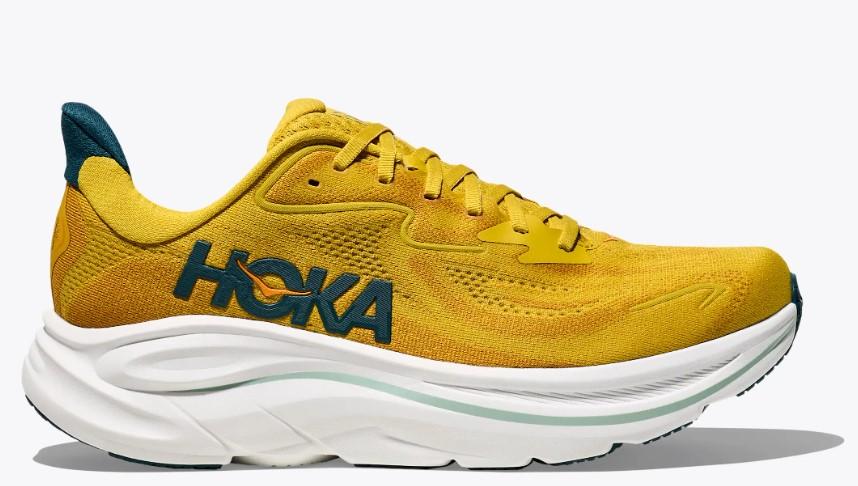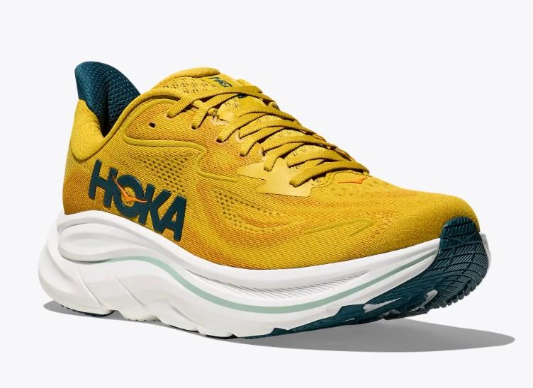 Calzado de running de Hoka One One para hombre Clifton 10 en color amarillo dorado.