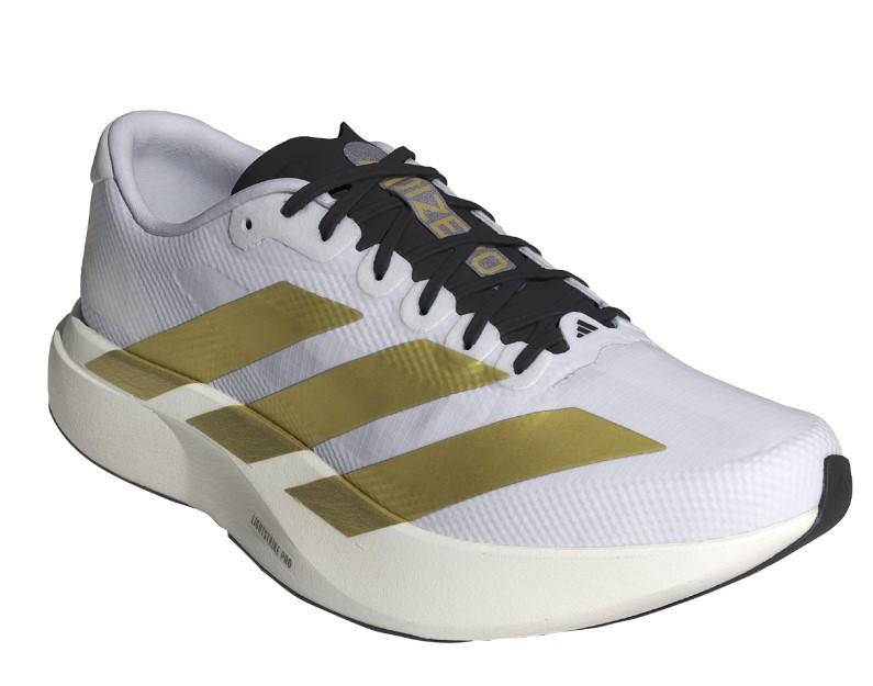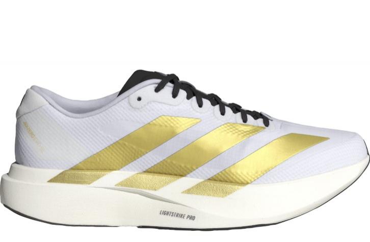Calzado de running de Adidas para hombre ADIZERO EVO SL en color blanco y dorado.